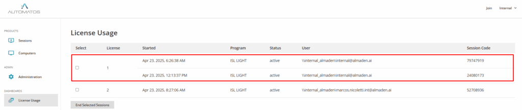 Each item in this list refers to an active session. The “Licence” column refers to the license number in use, not the quantity.